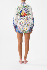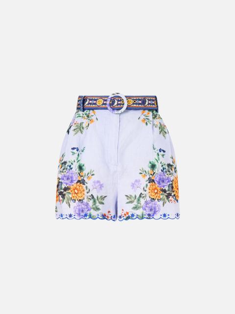 Designed in Australia, the Tiles Darls Wide Waistband Short reads the language of florals and tiles, blue and orange hues intertwine, a celebration of artisan hands and enduring beauty. Lovingly handcrafted, designed for effortless everyday wear, this luxury CAMILLA high waisted short features an adjustable waist detail that falls into softly that dance at the mini length hemline. - Waist Yoke - Wide Leg - Fixed Waistband - Crystal Embellishment SKU 00037799-TILEDARL-XXS Size and Fit Designed and fitted true to size, take your normal size. Fabric and Care 100% LINEN Made from flax fibres, this lightweight natural fibre offers a timeless aesthetic that adds durability and longevity to any wardrobe. Its breathability keeps your skin cool, minimises moisture and ensures effortless comfort.