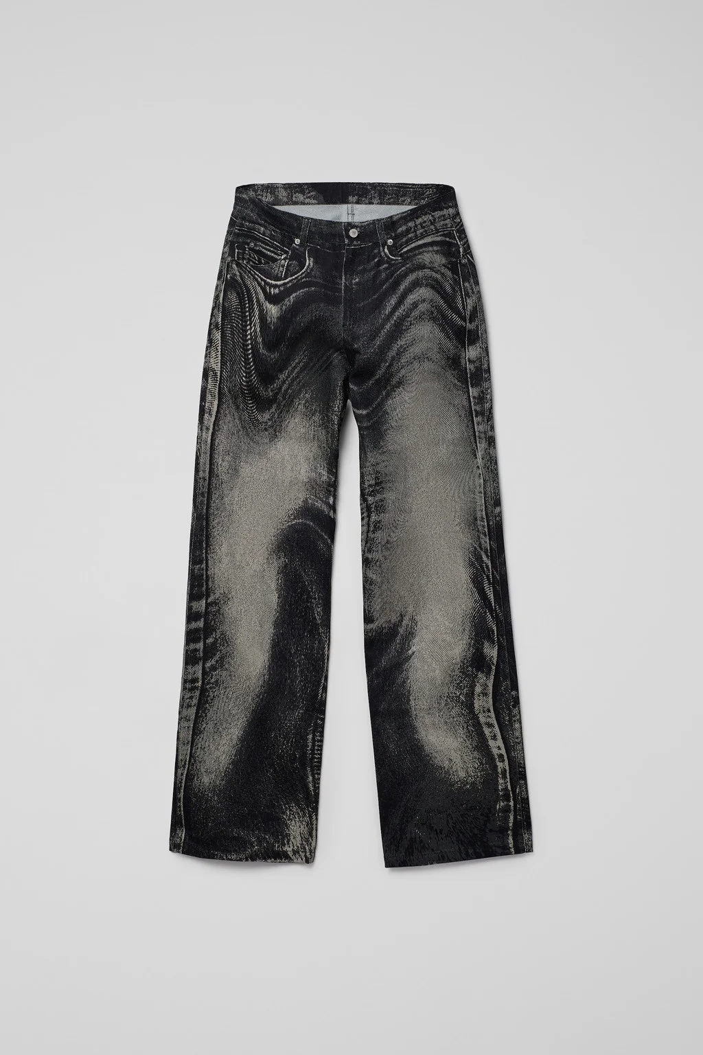 Black-gray jeans in premium Italian Candiani denim with CAMPERLAB's signature distorted print. Features Material 100% Organic Cotton (76% organic cotton - 24% upcycled postconsumer waste) Color Black-Gray Features Zip and button fly Belt loops Regular waist Long inseam length 5-pocket construction Size and Fit Relaxed unisex fit. Straight leg, long length. Male model is 191 cm and wearing size 30 Female model is 178 cm and wearing size 28
