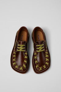 Brown calfskin leather boat shoes with green lacing, characterized by a pronounced square toe and rubber outsoles. Features Upper Calfskin leather Color Brown Outsole/Features Rubber Outsole> Lining 88% Calfskin 12% Textile (60% Nylon - 40% PU)