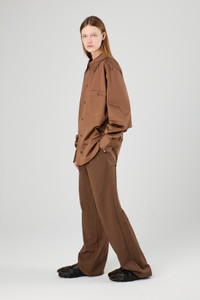 Brown shirt made from heavyweight Italian cotton with a satin finish, featuring a relaxed silhouette that enhances the classic button-up. Features Material 94% Cotton / 6% Elastane Color Brown Features Heavyweight Italian cotton fabric with satin construction and shiny effect Relaxed fit Patch pocket at chest with embroidered logo Adjustable sleeve buttons Size and Fit Unisex Male model is 185 cm and wearing size M Female model is 175 cm and wearing size M