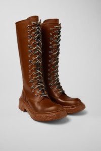 Brown calfskin leather high boots with organic cotton laces, OrthoLite® Recycled™ footbeds, and PU outsoles. Features Upper Calfskin leather Color Brown Outsole/Features Organic Cotton Laces 100% PU Insole OrthoLite® Recycled™ Non-Removable Footbed Lining 58% Calfskin 42% Recycled Polyester