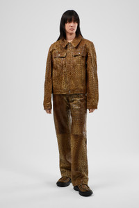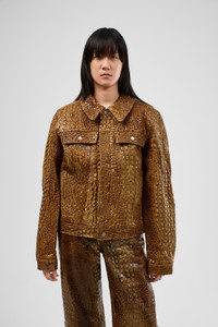 Brown leather jacket with embossed crocodile effect. Features Material 100% Leather Color Brown Features Relaxed unisex fit Two buttoned chest pockets Two slash body pockets Adjustable waist button Size and Fit Male model is 191 cm and wearing size M Female model is 178 cm and wearing size XS