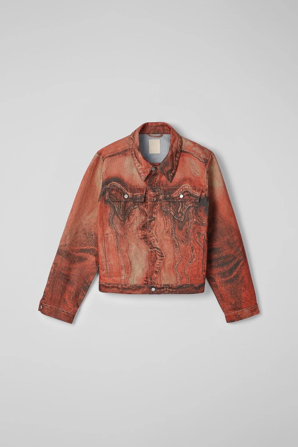 Burnt orange jacket in premium Italian Candiani denim with CAMPERLAB's signature distorted print. Features Material 100% Organic Cotton (76% organic cotton - 24% upcycled postconsumer waste) Color Orange Features Relaxed unisex fit Two buttoned chest pockets Two slash body pockets Adjustable waist button Adjustable buttoning at waist Size and Fit Unisex For a more fitted look, choose 1 - 2 sizes smaller than your regular size. Sleeves may be long on smaller frames. Male model is 191 cm and wearing size M Female model is 178 cm and wearing size S