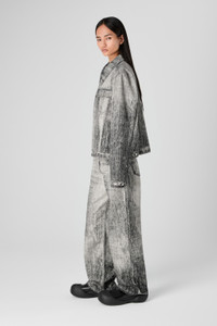 Faded black jacket in quality Candiani Italian denim, made from a soft washed organic cotton, featuring seasonal paint print. Features Material 100% Organic Cotton Color Faded Black Features Relaxed unisex fit Two buttoned chest pockets Two slash body pockets Adjustable waist button Size and Fit For a more fitted look, choose 1 - 2 sizes smaller than your regular size. Male model is 191 cm and wearing size 30 Female model is 178 cm and wearing size 28