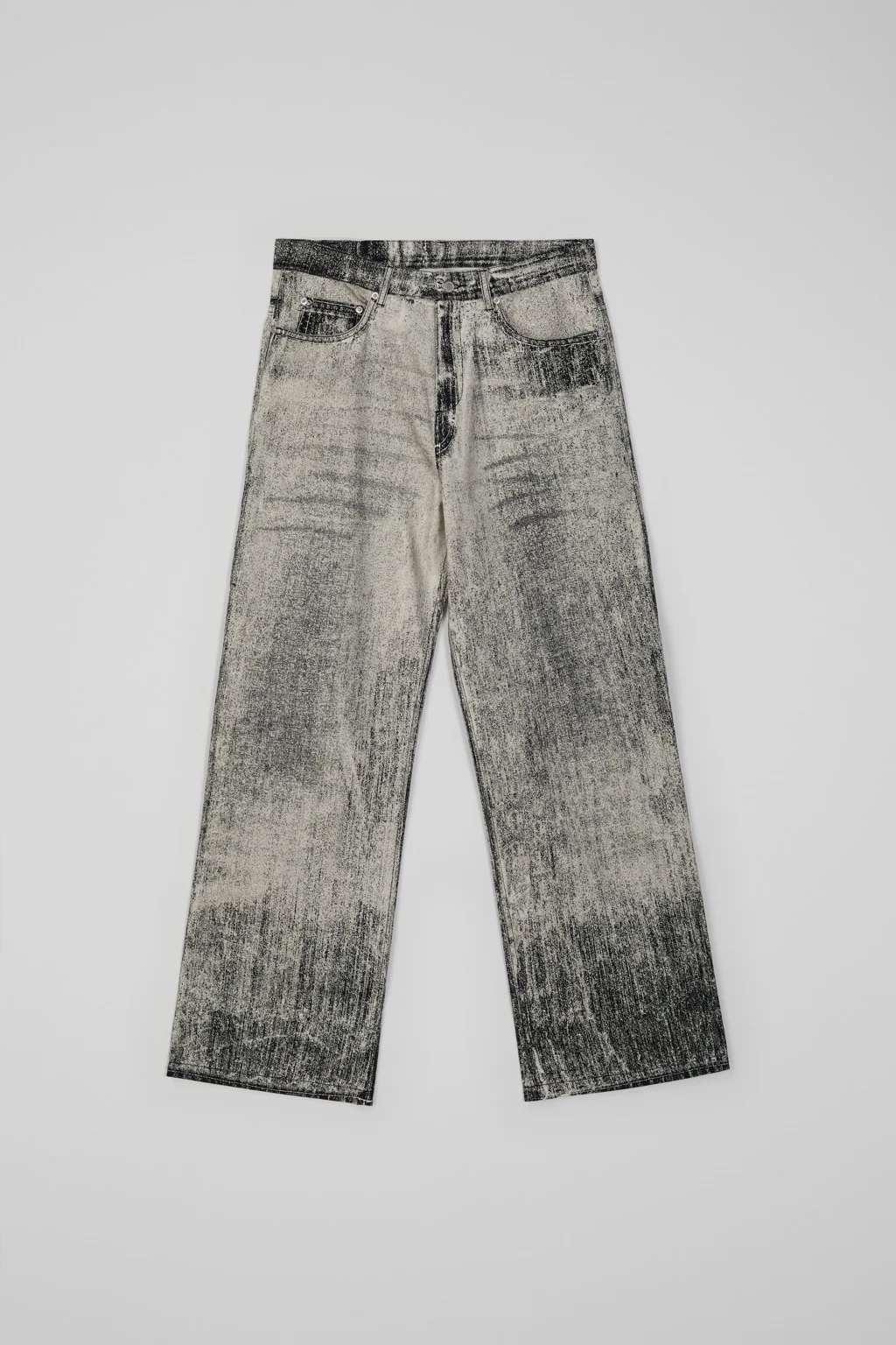 Faded Black jeans in quality Candiani Italian denim, made from a soft washed organic cotton, featuring seasonal paint print. Features Material 100% Organic Cotton Color Faded Black Features Zip fly Belt loops Regular waist 5-pocket construction Size and Fit Relaxed unisex fit. Straight leg, regular length. Male model is 191 cm and wearing size 30 Female model is 178 cm and wearing size 28
