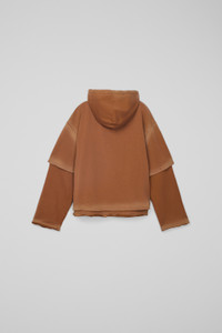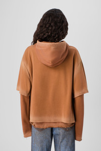Faded terracotta organic cotton layered long sleeve hoodie with cut-out details. Featuring hand-applied spray placement for a unique finish. Features Material Organic Cotton Color Faded terracotta with hand-applied spray placement Size and Fit - Relaxed fit - Wide neckline - Clean, structured lines - Dropped shoulder - Non-detachable sleeve layers