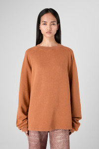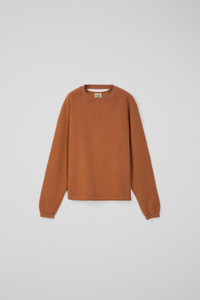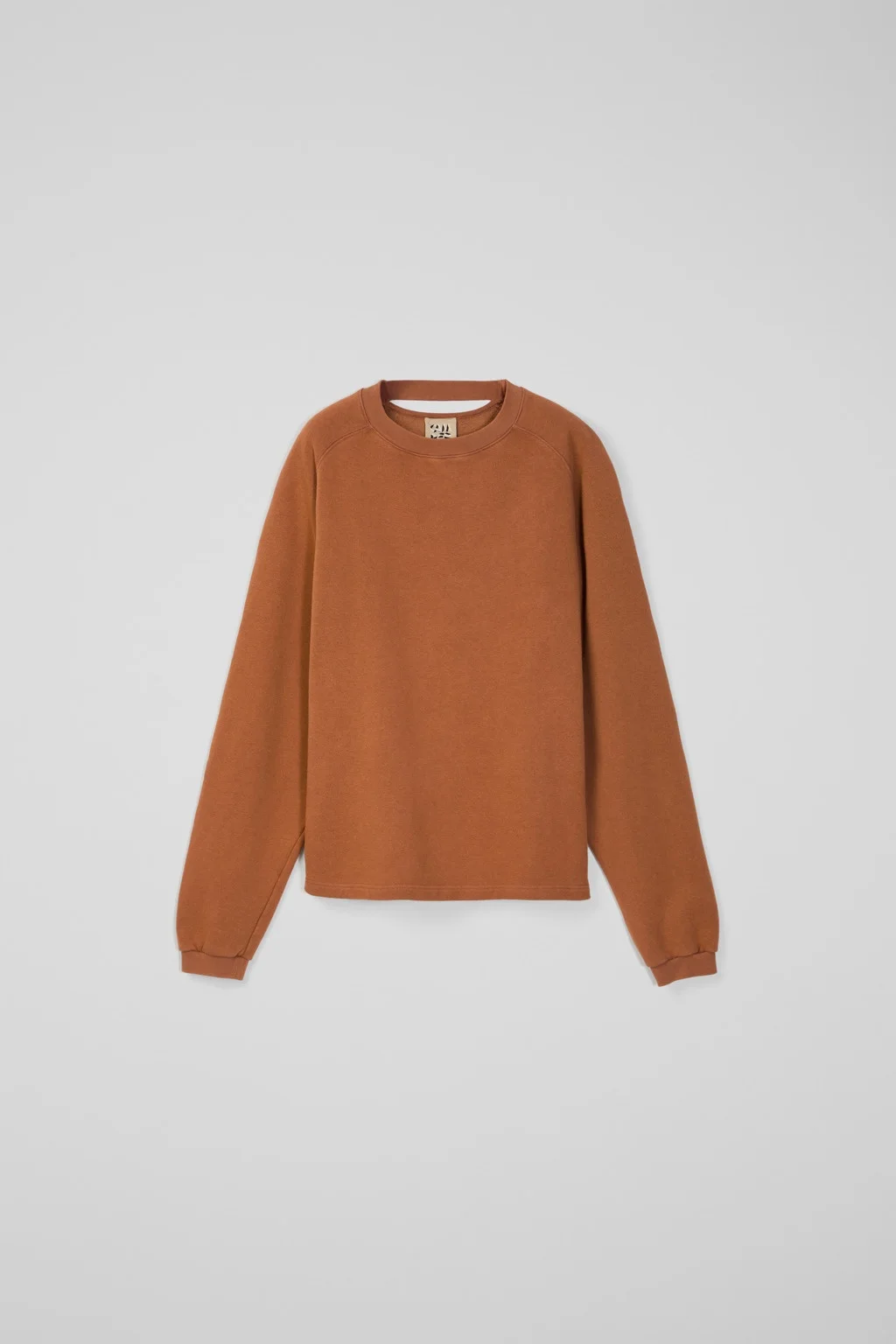 Faded Terracotta crewneck jersey with a unique cut-out neck detail. Made from a blend of PYRATEX® certified organic cotton and circulose fiber, sourced from post-consumer textile waste, this fabric is crafted using renewable energy. A perfect blend of style and sustainability Features Material 70% Organic Cotton / 30% Viscose (CIRCULOSE®) Color Terracotta Features Crew neck Medium-weight fleece with loopback Cut-out neck collar detail at back Washed look Size and Fit Unisex Boxy fit Male model is 185 cm and wearing size M Female model is 177 cm and wearing size XS