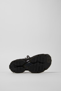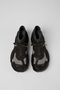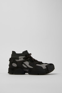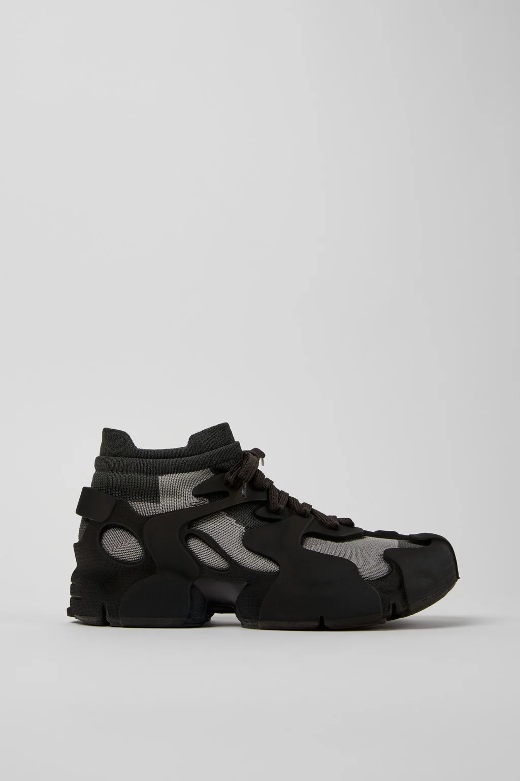 Gray caged sneakers with water-repellent 3D-knitted recycled PET sock interiors, direct injection TPU exteriors, and recycled PU outsoles. Fully recyclable. Features Upper Textile / Synthetic Color Black / Gray Outsole/Features PU / TPU Insole PU Removable Footbed Lining 80% textile (75% recycled polyester - 14% Hilo PU - 11 spandex) 20% recycled polyester