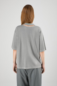 Gray T-shirt in 100% mineral-dyed organic cotton with cut-out detail at back and seasonal print. Features Material 100% Organic Cotton Color Gray Features Cropped length Printed scribbled logo artwork at front Cut-out neck detail Size and Fit Unisex For a more cropped look, size down. Male model is x cm and wearing size Female model is x cm and wearing size