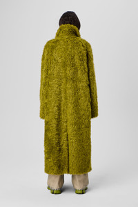 Green textured long-pile coat with an oversized fit. Features Material 50% Modacrylic, 34% Acrylic, 16% Recycled Polyester Color Green Features - Pockets Size and Fit Oversized, full-length silhouette Wide lapel Raglan sleeve