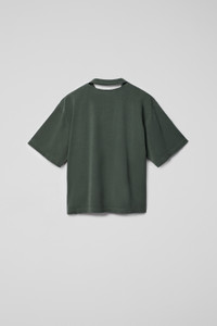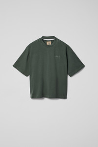 Green T-shirt in 100% mineral-dyed organic cotton. Features Material 100% Organic Cotton Color Green Features - Crewneck - Short sleeves - Cut-out detail Size and Fit Unisex For a more cropped look, size down. Male model is 189cm and wearing size M Female model is 179cm and wearing size M Female Model Measurment Bust: 80 cm Waist: 60 cm Hips: 88 cm Male Model Measurment Bust: 88 cm Waist: 69 cm Hips: 90 cm