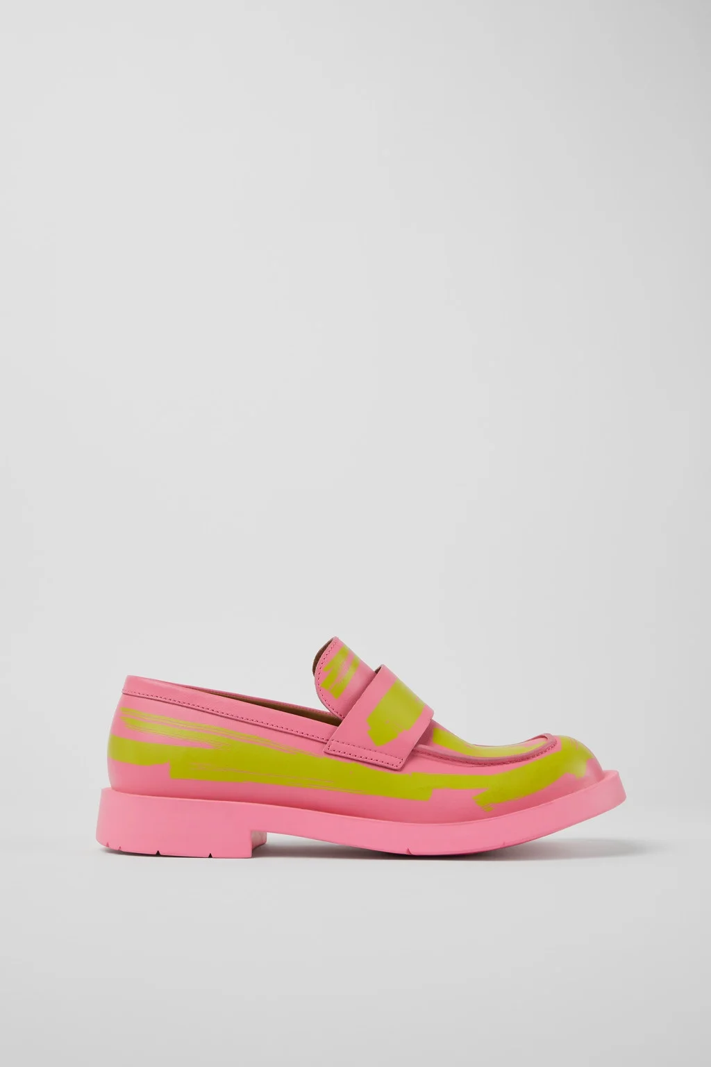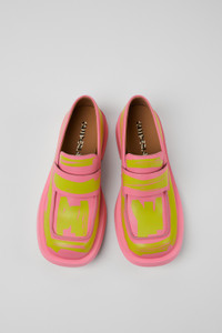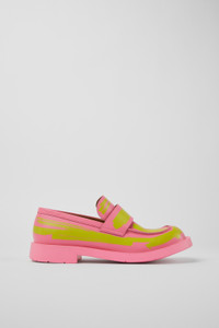 Pink and green leather loafers with rubber outsoles. Features Upper Calfskin (Leather Working Group Certified) Color Pink / Green Outsole/Features Rubber / Natural rubber / Recycled rubber Insole OrthoLite® for cushioning Upper 73% calfskin 27% textile (45% recycled polyester - 35% recycled cotton - 20% viscose)