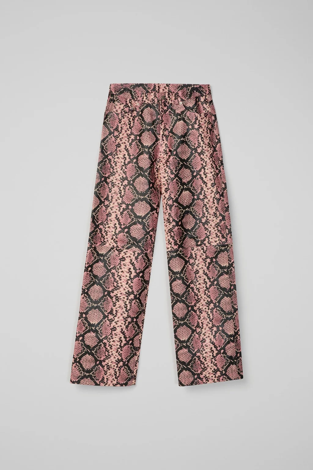 Pink, black and gray leather trousers with an embossed snake effect. Features Material Body: 100% Leather Lining: 100% Polyester Color Pink Features Regular waist Long inseam length 5-pocket construction Zip fly Size and Fit Relaxed unisex fit. Straight leg, long length. Male model is 191 cm and wearing size 28 Female model is 178 cm and wearing size 28