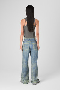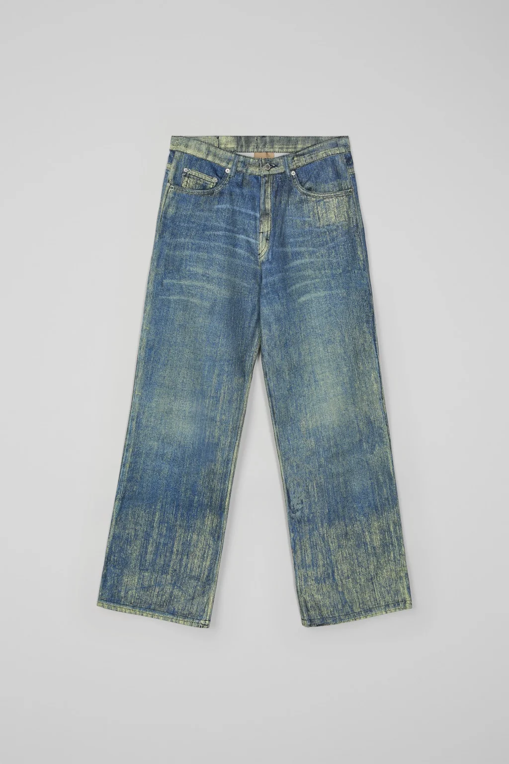 Sand Blue jeans in quality Candiani Italian denim, made from a soft washed organic cotton, featuring seasonal paint print. Features Material 100% Organic Cotton Color Sand Blue Features Zip fly Belt loops Regular waist 5-pocket construction Size and Fit Relaxed unisex fit. Straight leg, regular length. Male model is 191 cm and wearing size 30 Female model is 178 cm and wearing size 28