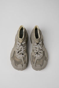 Stone gray caged sneakers with water-repellent 3D-knitted recycled PET sock interiors, direct injection TPU exteriors, and recycled PU outsoles. Fully recyclable.<br/><br/>CAMPERLAB has partnered with design studio CONCEPT(K), the product program of CONCEPTKICKS, to reimagine Tossu, celebrating their shared dedication to the creation process.<br/><br/>The collaboration merges both design philosophies in a new treatment inspired by raw materials and textures, featuring muted earth-toned shades of gray and beige that reflect CONCEPT(K)’s signature concrete-inspired palette.