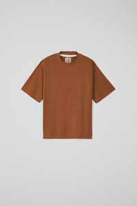 Terracotta crewneck t-shirt with a unique cut-out neck detail. Made from a blend of PYRATEX® certified organic cotton and circulose fiber, sourced from post-consumer textile waste, this fabric is crafted using renewable energy. A perfect blend of style and sustainability Features Material 50% Organic Cotton / 50% Viscose (CIRCULOSE®) Color Terracotta Features Crew neck Cut-out neck collar detail at back Washed look Size and Fit Boxy unisex fit Male model is 185 cm and wearing size M Female model is 177 cm and wearing size XS