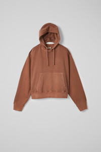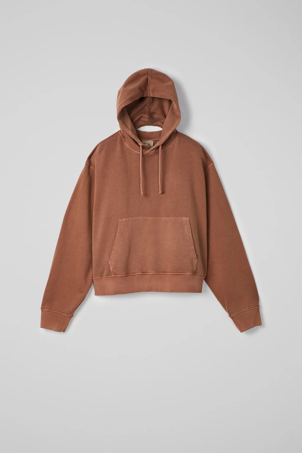 Terracotta hoodie in 100% mineral-dyed organic cotton with cut-out detail at back. Features Material 100% Organic Cotton Color Terracotta Features Cropped length Drawstring hood Pouch pocket Printed scribbled logo artwork at back Cut-out neck detail Size and Fit Unisex For a more cropped look, size down. Male model is 189 cm and wearing size M Female model is 179 cm and wearing size M