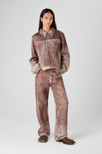 Terracotta jacket in quality Candiani Italian denim, made from a soft washed organic cotton, featuring seasonal paint print. Features Material 100% Organic Cotton Color Terracotta Features Relaxed unisex fit Two buttoned chest pockets Two slash body pockets Adjustable waist button Size and Fit For a more fitted look, choose 1 - 2 sizes smaller than your regular size. Male model is 191 cm and wearing size 30 Female model is 178 cm and wearing size 28