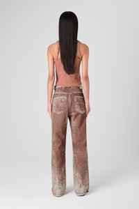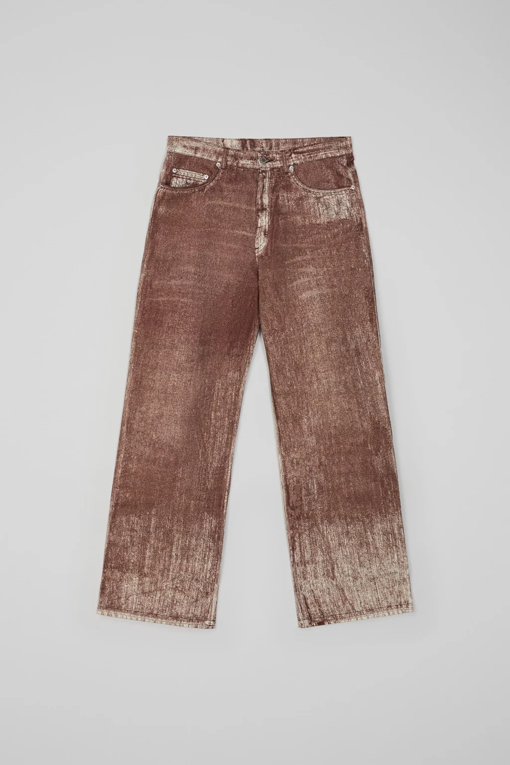 Terracotta jeans in quality Candiani Italian denim, made from a soft washed organic cotton, featuring seasonal paint print. Features Material 100% Organic Cotton Color Terracotta Features Zip fly Belt loops Regular waist 5-pocket construction Size and Fit Relaxed unisex fit. Straight leg, regular length. Male model is 191 cm and wearing size 30 Female model is 178 cm and wearing size 28