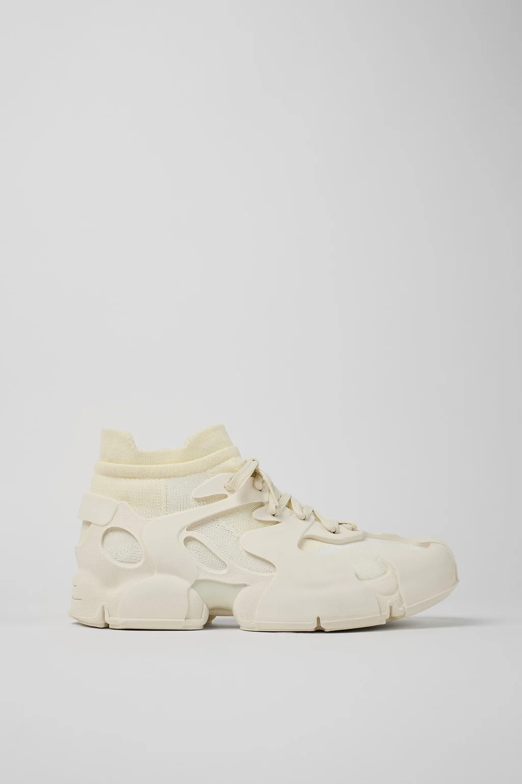 White caged sneakers with water-repellent 3D-knitted recycled PET sock interiors, direct injection TPU exteriors, and recycled PU outsoles. Fully recyclable. Features Upper Textile / Synthetic Color White Outsole/Features PU / TPU Insole PU Removable Footbed Lining 80% textile (75% recycled polyester - 14% Hilo PU - 11 spandex) 20% recycled polyester
