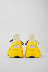 Yellow caged sneakers with water-repellent 3D-knitted PET sock interiors, direct injection TPU exteriors, and recycled PU outsoles. Fully recyclable. Features Upper Textile / Synthetic Color Yellow Outsole/Features PU / TPU Insole PU Lining 80% textile (75% recycled polyester - 14% Hilo PU - 11 spandex) 20% recycled polyester
