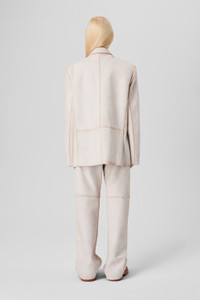 White cracked leather blazer sanded to reveal terracotta base color creating a unique, textured finish. Variations in sanding and any irregularities are not defects but natural characteristics of the material. Features Material Sheep leather Color White Size and Fit - Relaxed tailoring - True to size fit - For formal and casual styling - Sharp, defined shoulder