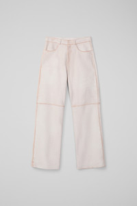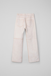 White cracked leather trousers sanded to reveal terracotta base color creating a unique, textured finish. Variations in sanding and any irregularities are not defects but natural characteristics of the material. Features Material Sheep leather Color White Size and Fit - Relaxed fit - Mid-rise - Full length