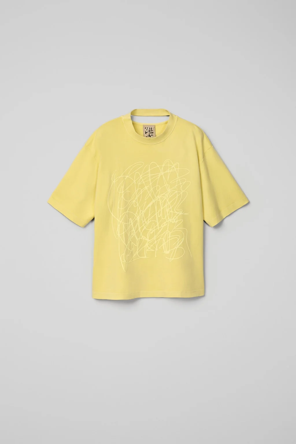 Yellow T-shirt in 100% mineral-dyed organic cotton with cut-out detail at back and seasonal print. Features Material 100% Organic Cotton Color Yellow Features Cropped length Printed scribbled logo artwork at front Cut-out neck detail Size and Fit Unisex For a more cropped look, size down. Male model is x cm and wearing size Female model is x cm and wearing size