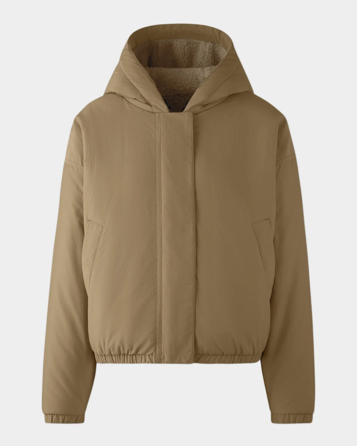 Crafted from Kind highpile fleece that reverses to cotton nylon Bold Ripstop, the "Alberni" bomber jacket by Canada Goose offers versatile styling with endless coldweather protection Hooded neckline; twoway zipfront Dropped shoulders Long sleeves with elastic cuffs Signature logo patch on the left sleeve Side pockets with snap closure Relaxed fit Elasticized hem Cotton/nylon/polyamide Dry clean Imported