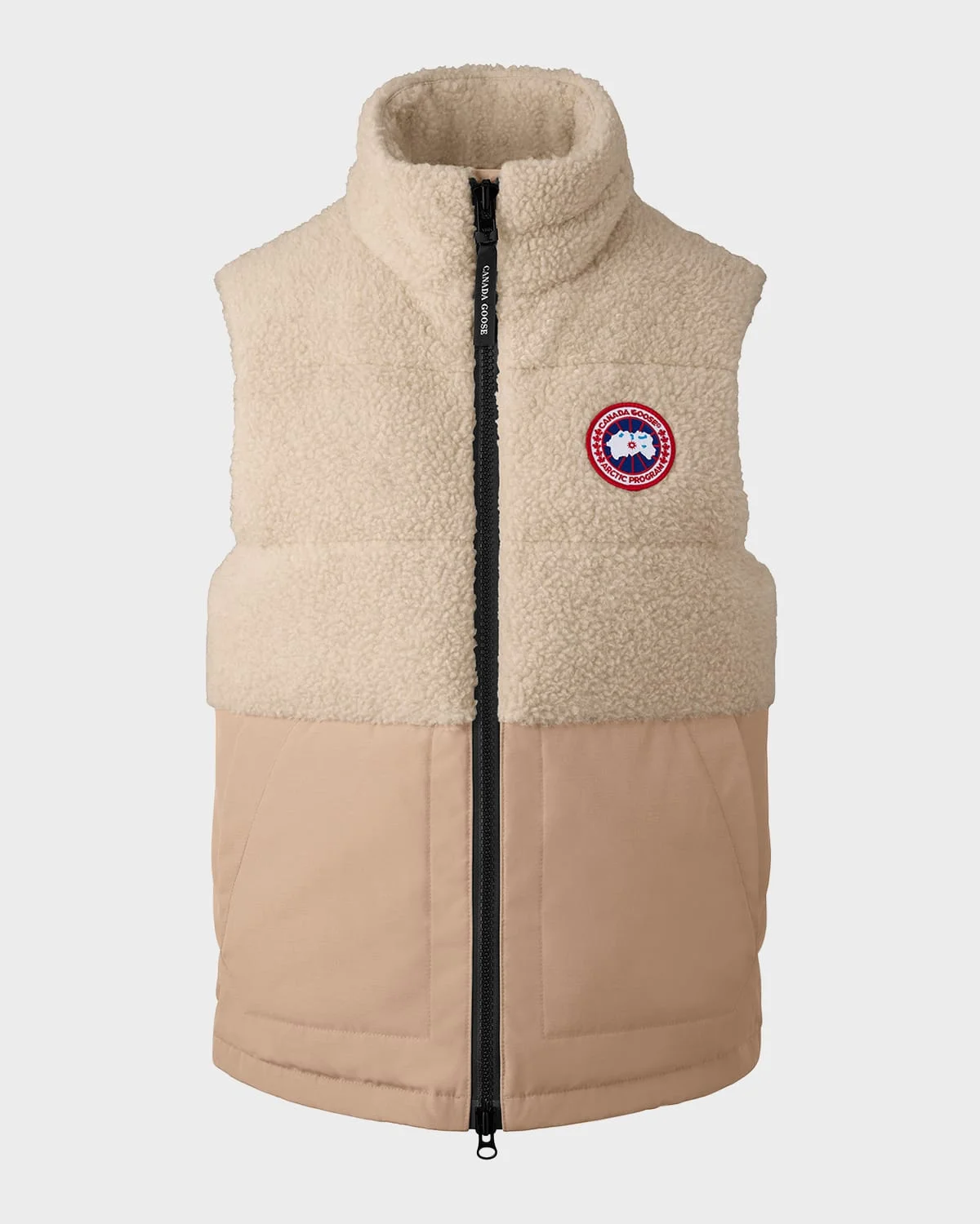 Canada Goose "Elora" puffer vest designed with a waterrepellant finish to keep you protected wherever adventure takes you Highpile fleecelined stand collar Twoway front zipper Signature chest logo patch Sleeveless Two exterior triplefunction layered pockets One interior security pocket Hip length Intentionally relaxed fit Polyester/wool/lyocell Feather/Down fill Do not iron, dry clean Made in Canada
