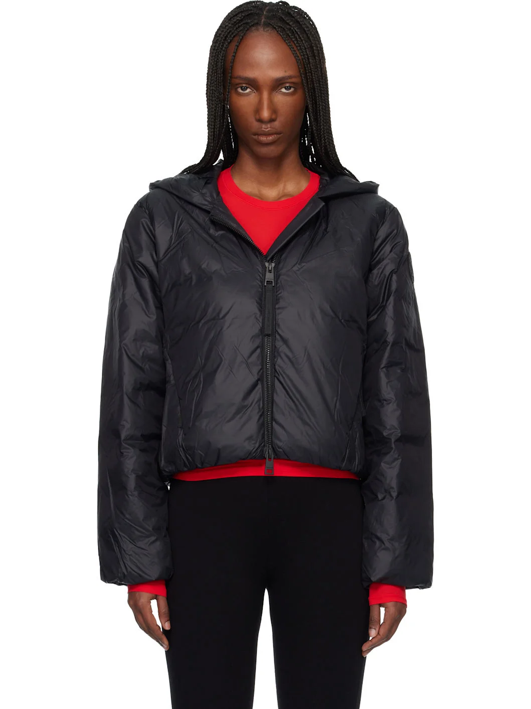 Down-filled nylon satin jacket. · Water-repellent, wind-resistant, and packable · Bungee-style drawstring at hood · Two-way zip closure · Zip seam pockets · Bungee-style drawstring at hem · Embroidered logo patch at sleeve · Elasticized cuffs · Elasticized logo-woven shoulder straps at interior · Zip pocket at interior · Fully lined Supplier color: Black Body: 100% polyamide. Fill: 90% duck down, 10% duck feather. Lining: 100% polyamide. Made in Canada 261014F061013