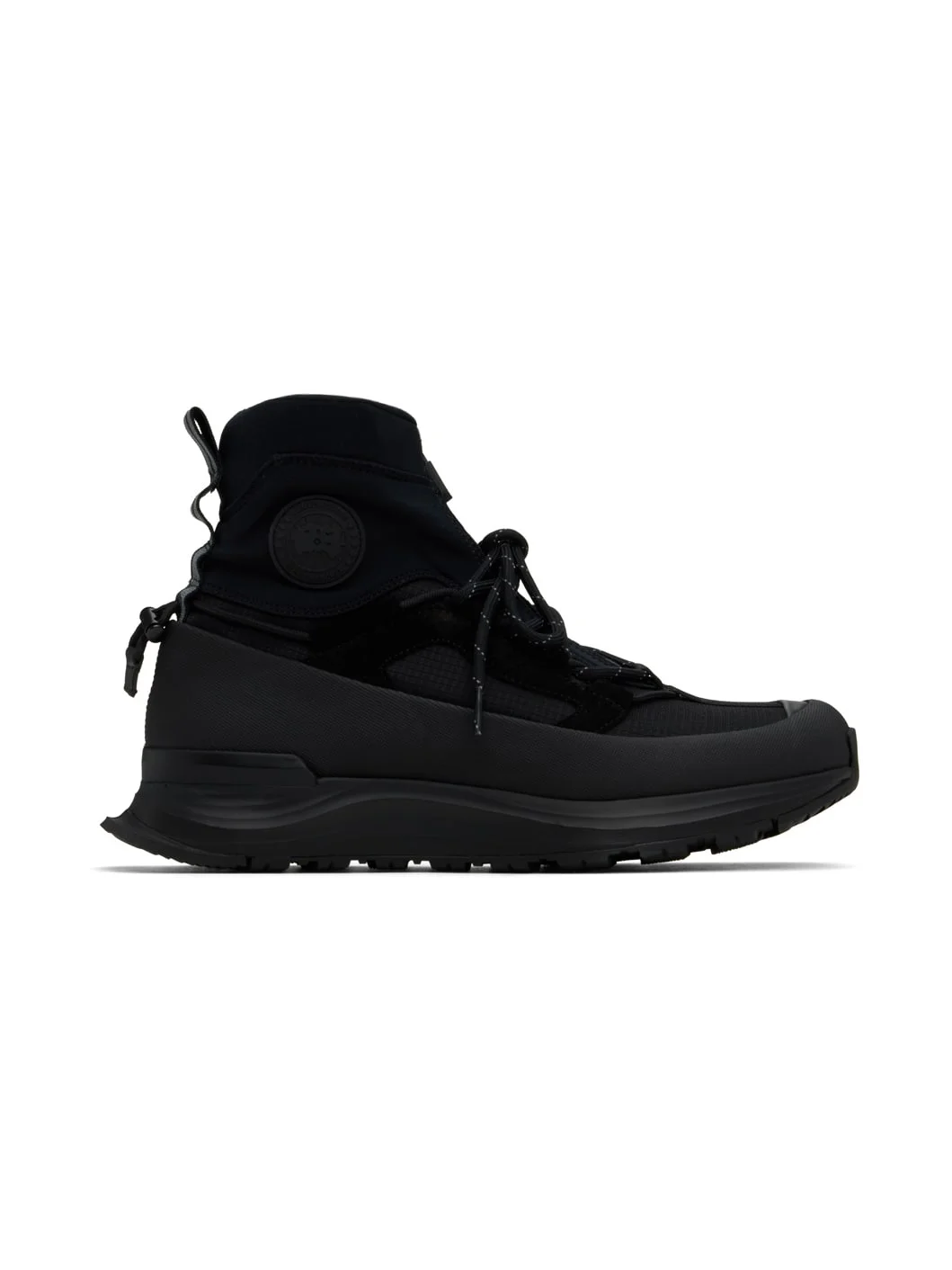 High-top paneled ripstop, suede, and jersey sneakers in black. · Waterproof · Lace-up closure · Zip closure at vamp · Cord-lock ankle drawstring · Padded sock-style collar · Rubberized logo patch at outer side · Reflective pull-loop at heel collar · HDry® jersey lining · Microfibre onSteam® footbed · Rubber heel stabilizer at foam rubber midsole · Treaded rubber sole Supplier color: Black Upper: textile, leather. Sole: rubber. Made in Portugal 242014F127000