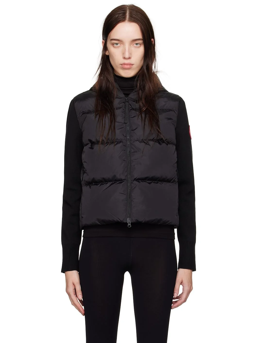 Down-filled and quilted lightweight nylon taffeta and stretch knit merino wool down jacket. · Two-way zip closure · Seam pockets at front · Bungee-style drawstring at hem · Embroidered logo patch at sleeve · Rib-knit cuffs Supplier color: Black Fill: 90% duck down, 10% duck feather.