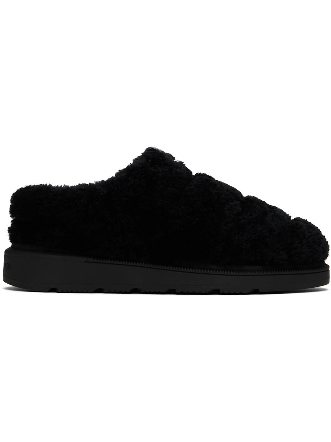 Shearling mules in black. · Logo hardware and pull-loop at vamp · Webbing trim at heel collar · Logo embossed at heel · Serrated edge at welt · Treaded rubber sole Supplier color: Black Upper: sheepskin. Sole: rubber. Made in Portugal 242014F121000