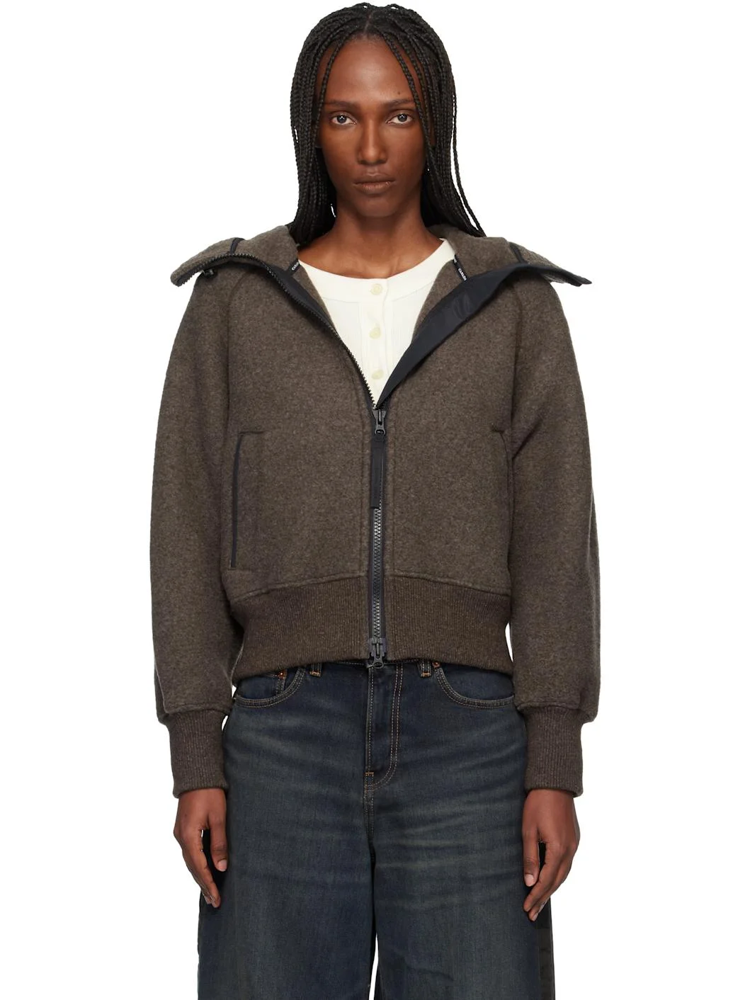 Recycled wool-blend melton bomber jacket. · Bungee-style drawstring at hood · Funnel neck · Zip closure · Welt pockets at front · Rib-knit hem and cuffs · Raglan sleeves · Embroidered logo patch at sleeve Part of the Black Label collection. Supplier color: Terra/Terra Body: 60% recycled wool, 16% lyocell, 13% polyester, 8% polyamide, 3% other fibers. Trim: 66% recycled wool, 19% lyocell, 10% polyamide, 4% other fibers, 1% elastane. Made in Canada 261014F097004