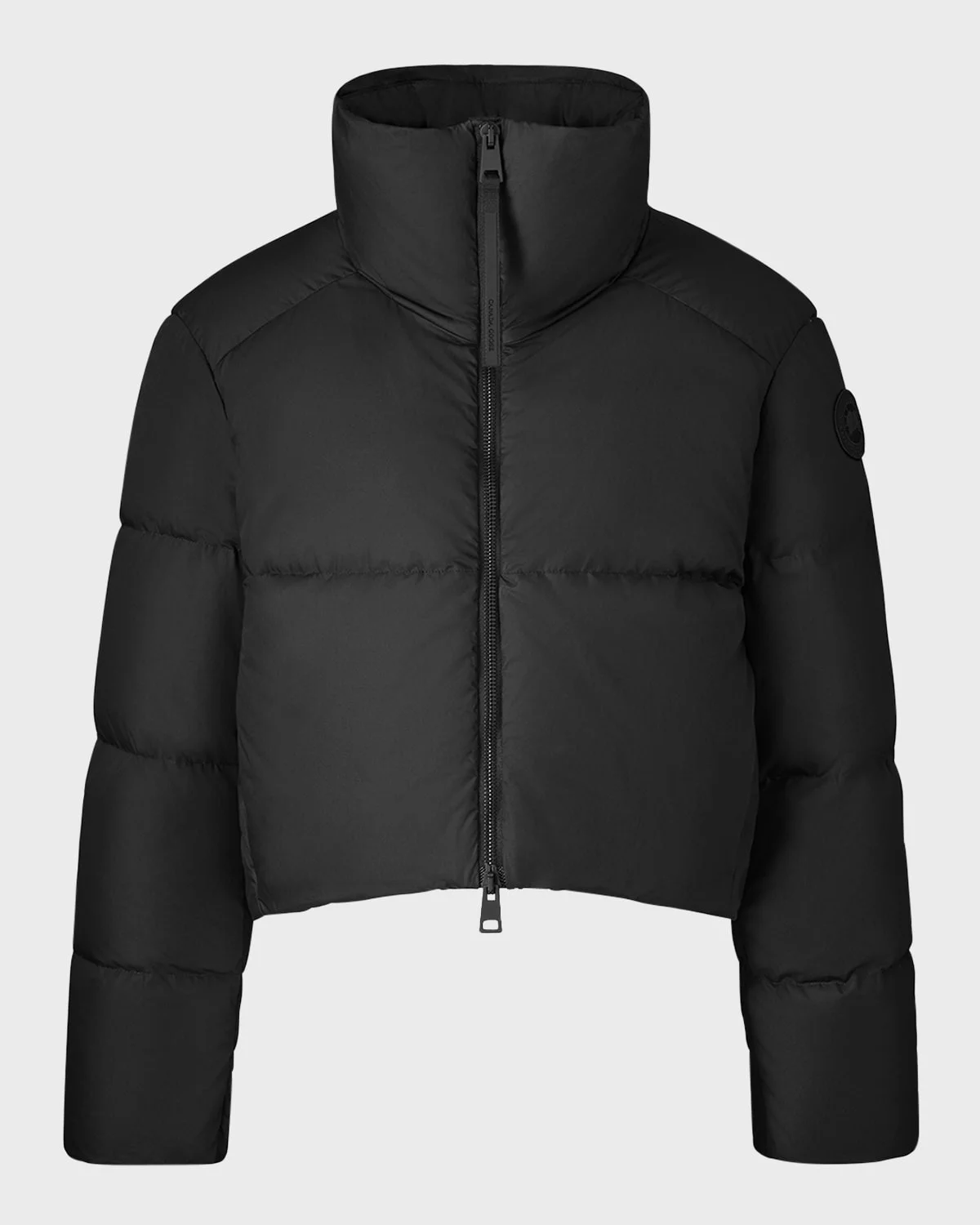 - Canada Goose "Garnet" puffer jacket crafted in an ultra-luxe water-repellent fabric with a matte, dry finish - Elevated with performance attributes - water-repellent, wind-resistant, durable, and down-proof - Stand collar - Down-filled storm guard under a two-way zipper closure - Long sleeves; recessed rib-knit cuffs for added warmth - Logo patch at left sleeve - Removable backpack straps - Two exterior zippered pockets - Two interior drop-in pockets - Cropped length - Minimal streamlined silhouette - Interior hem drawcord for enhanced fit - Pima cotton - Partially lined - Fill: Down/Feather - Do not iron, dry clean - Made in Canada - Model is 5'10"/177cm.
