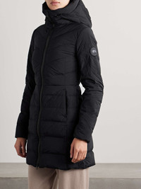 EDITORS'NOTES Canada Goose's 'Clair' coat is made from the brand's 'Aira' fabric - a smooth, water-resistant shell with two-way stretch. It's quilted for warmth and has considered details like a suede chin guard, an adjustable hood and internal straps for hands-free carrying. Use the internal pockets to secure your essentials. SIZE & FIT - Fits true to size, take your normal size - Intended for a slim fit - Padded, non-stretchy fabric - Model is 177cm/ 5'10" and is wearing a size Small DETAILS & CARE - Black shell - Two-way zip fastening through front - 87% polyamide, 13% elastane; filling: 90% down, 10% feathers (Duck); lining: 87% polyamide, 13% elastane - Machine wash