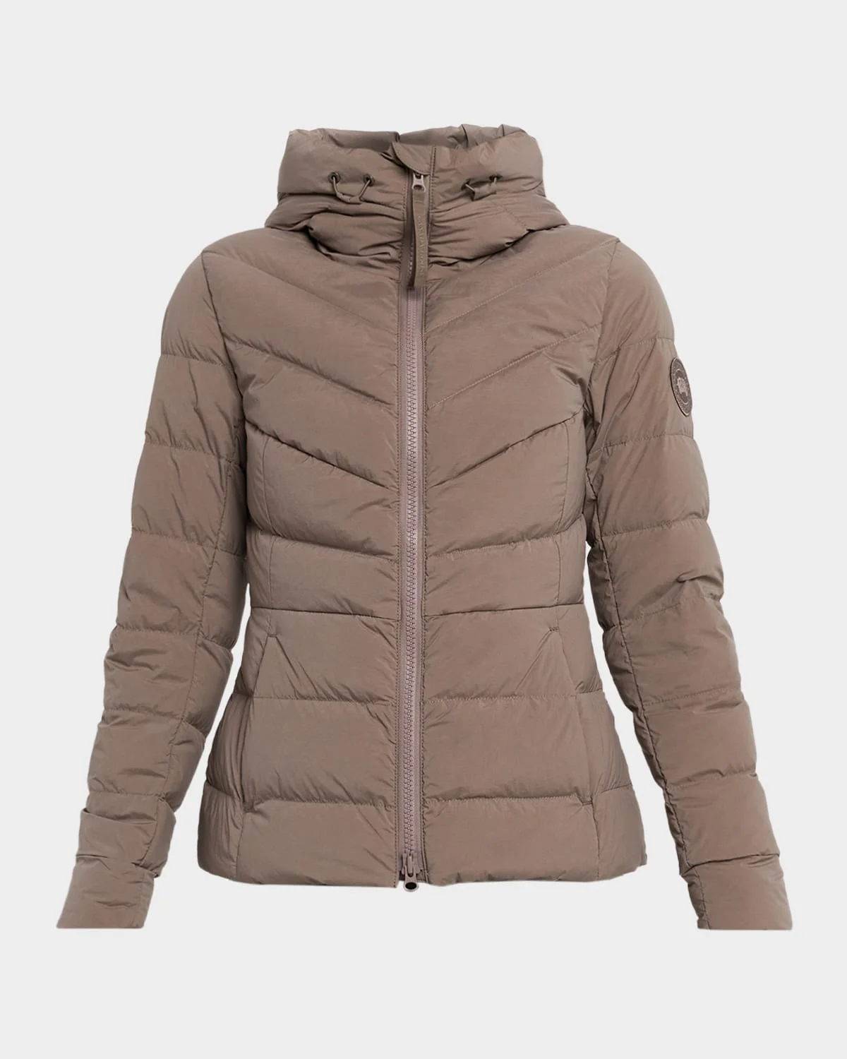 Crafted in twoway stretch Aira fabric with a matte finish, the "Clair" down jacket by Canada Goose features contour quilting to hug your body without compromising warmth. Cold weather protection down to 5°F. Interior backpack straps for handsfree carrying Adjustable hooded neckline; twoway zipfront Long sleeves with Power Stretch® cuffs Signature logo patch on the left sleeve Side fleecelined zip pockets Fitandflare silhouette Hem sits at the hip Nylon/polyamide/spandex Fill: Down/feather Lining: Nylon Machine wash cold, inside out Made in Canada