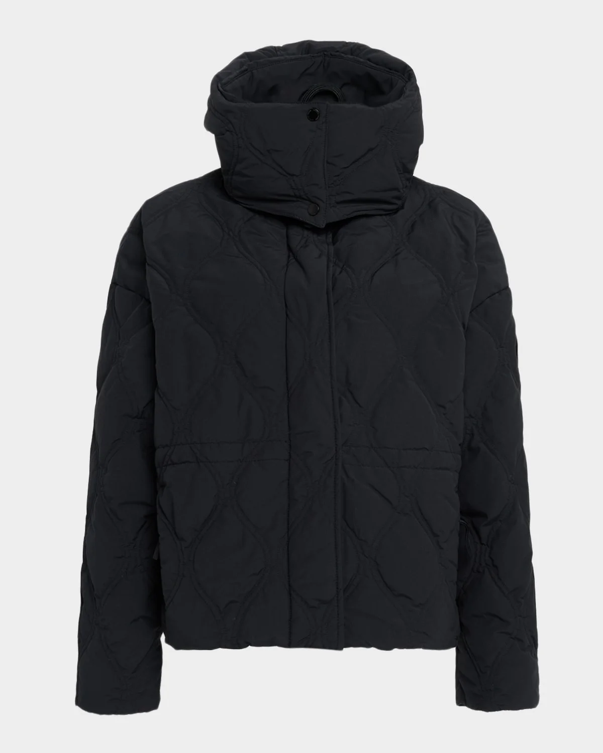 A bold silhouette, the "Claremont" bomber jacket by Canada Goose is crafted in signature recycled organic Arctic Tech® fabric with a waterrepellent finish for protection without compromising style. Cold weather protection down to 5°F. Hooded neckline with zips for a split collar Long ruched sleeves with ribknit cuffs Signature logo patch on the left sleeve Adjustable drawcord waist Chest pockets; lower flap pockets Relaxed fit Ribknit hem Contrast placket over twoway zip Polyester/cotton Fill: Down/feather Lining: Nylon Dry clean Made in Canada