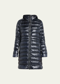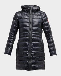 - Canada Goose "Cypress" jacket with hood. - Approx. 33.25" from shoulder to hem, based on a size small - Down-filled adjustable hood; signature double-stripe reflective details at back - Stand collar - Long articulated sleeves, underarm gussets, recessed power stretch cuffs - Two hand pockets with zip closure, two interior drop-in pockets - Adjustable belt closure with webbing and snaps - Mid-thigh length. - Front two-way zip closure, storm flap - Recycled nylon shell. - 90/10 duck down/feather fill. - Remove backpack straps before cleaning. Turn garment inside out. Machine wash cold on gentle cycle, tumble dry low, do not dry clean. - Made in Canada of imported material. - Model measurements: 5'10" height, 33.5" bust, 23.5" waist, 34.5" hips, wearing a size small.Fashioned for change: responsible manufacturing. Find out more - here