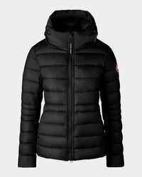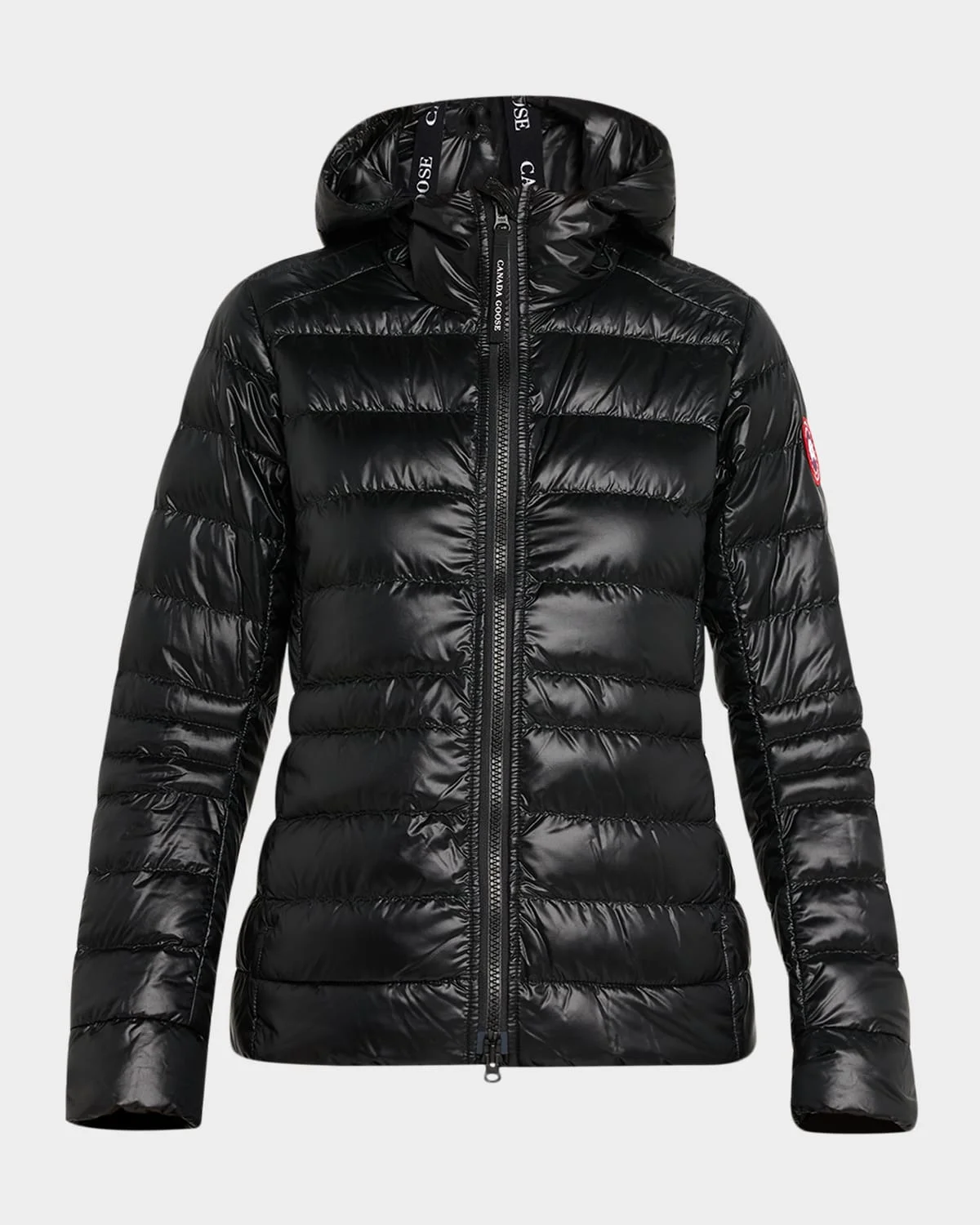 - Canada Goose "Cypress" hooded puffer jacket that is packable into the interior left pocket - Adjustable drawcords at hood - Two-way zip front - Long sleeves; logo patch at left - Side slip pockets - Interior backpack strap - Hip length - Relaxed fit - Recycled nylon - Lining: Recycled nylon - Fill: Feather/down - Machine wash cold - Made in Canada - Size Note: Item runs small, consider ordering a size up. - Fashioned for change: responsible manufacturing. Find out more - here