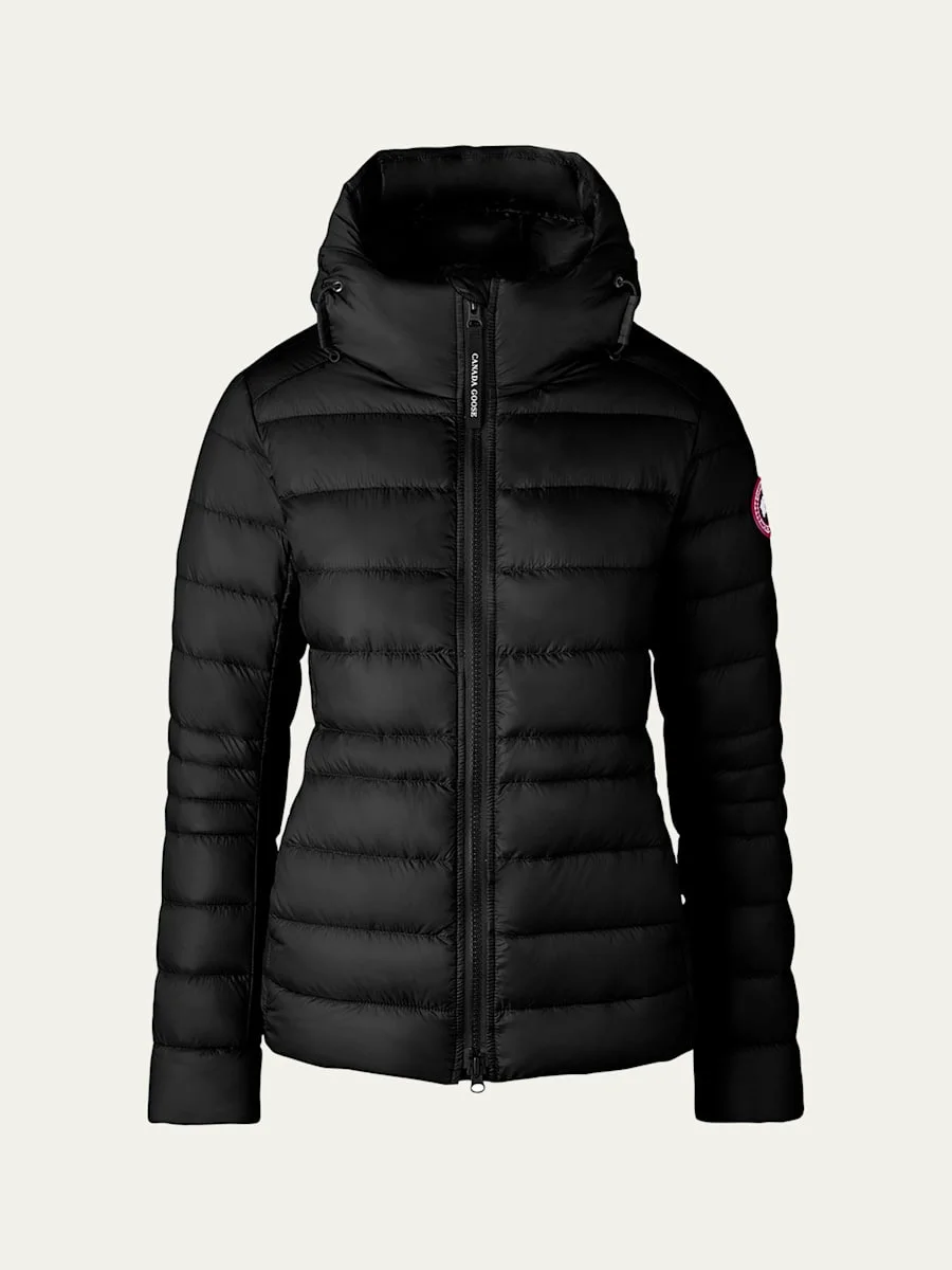 Canada Goose "Cypress" hooded puffer jacket that is packable into the interior left pocket Adjustable drawcords at hood Twoway zip front Long sleeves; logo patch at left Side slip pockets Interior backpack strap Hip length Relaxed fit Recycled nylon Lining: Recycled nylon Fill: Feather/down Machine wash cold Made in Canada