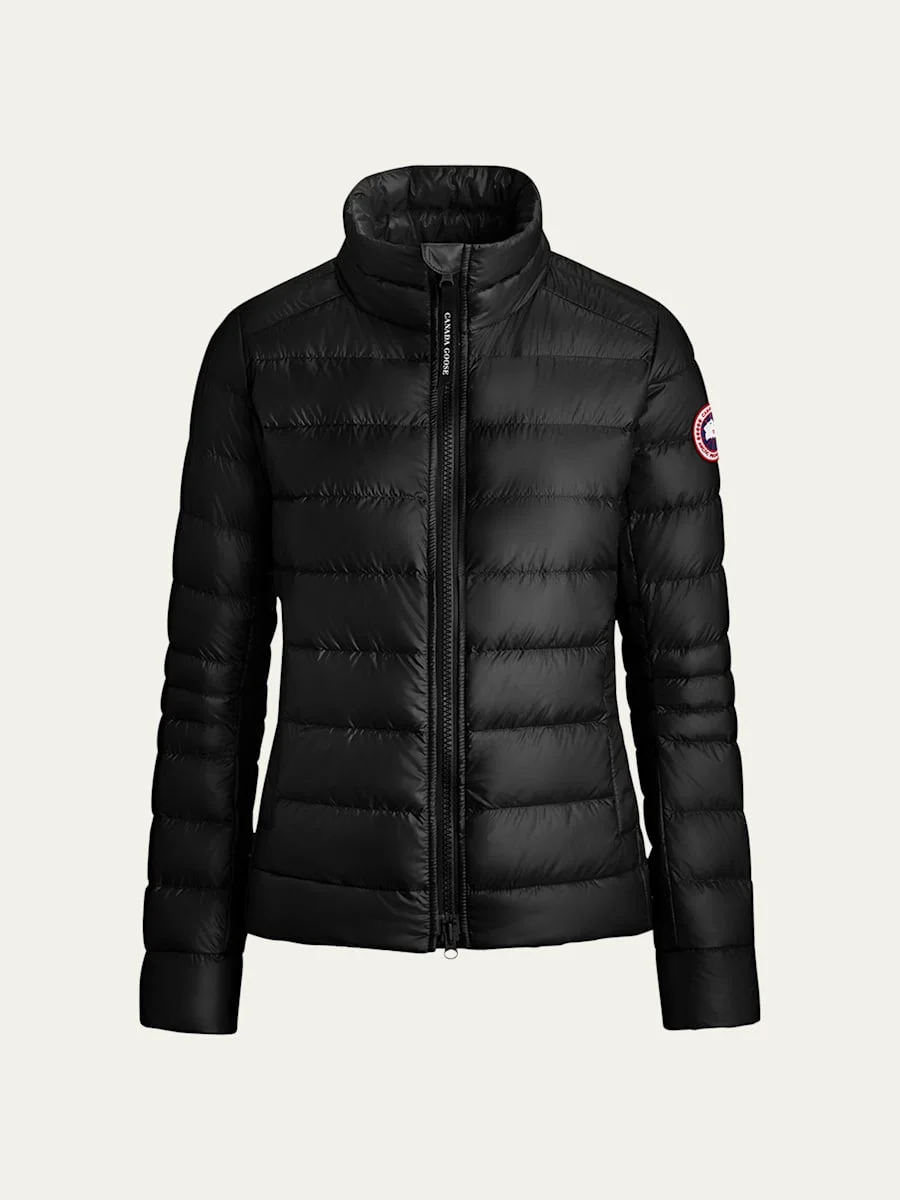 Canada Goose "Cypress" short puffer jacket. Approx. 26"L Features interior backpack straps for handsfree carry. Collared neckline; reflective doublestripe back. Long sleeves; logo patch at left arm. Exposed front zip. Side welt pockets. Standard fit. Hip length. Recycled nylon shell. White duck down fill. Machine wash; tumble dry Made in Canada.