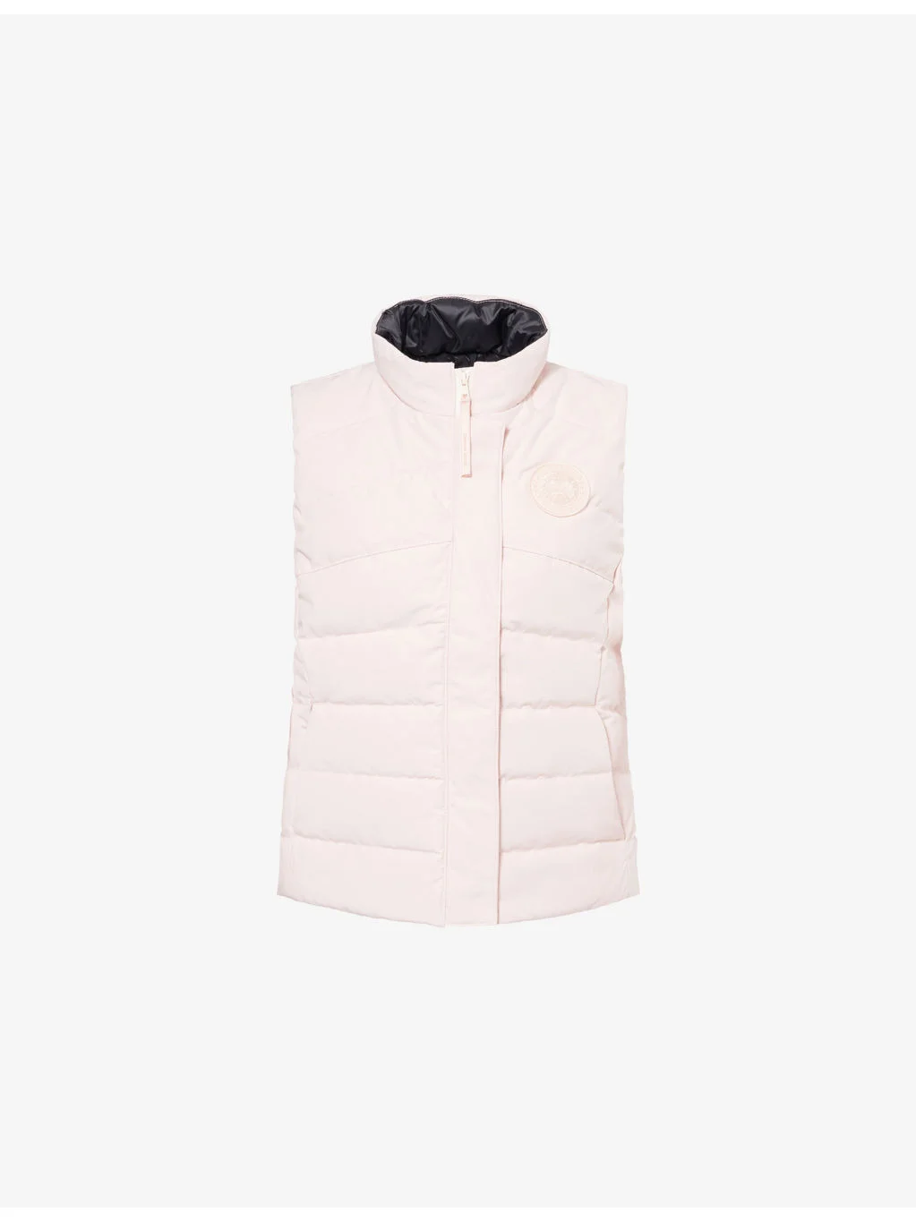 PRODUCT DETAILS - Canada Goose woven-down gilet - 84% polyester, 16% cotton - Zip fastening - Regular fit, funnel neck, sleeveless, logo patch at chest, concealed zip pockets at front, quilted and padded, branded hardware - Dry clean - Size small: length 24in / 61cm - Model is 5ft 10in/1.78m and wears a size small - Midweight, non-stretch Ref: R04540892