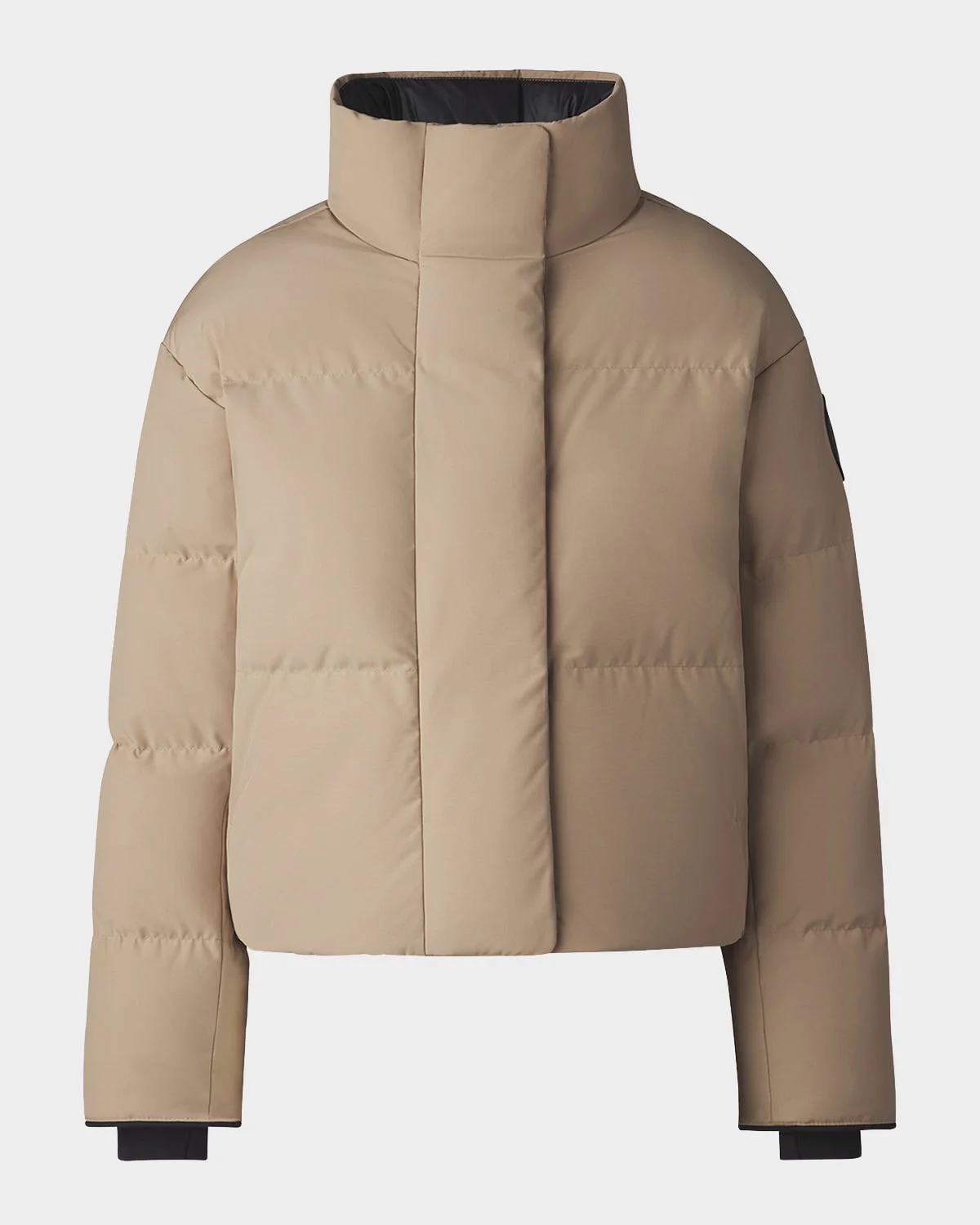 Canada Goose "Grandview" durable puffer jacket Stand collar Snap button closure over twoway zipper Long sleeves; ribknit cuffs Black logo disc at left sleeve Fixed backpack straps Two exterior sideentry zippered hand pockets Three interior pockets: two mesh dropin pockets, one zippered security pocket Cropped length Interior drawcord at hem Polyester/organic cotton Lining: Recycled nylon Fill: Down/Feather Do not iron, dry clean Made in Canada