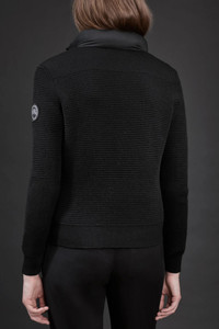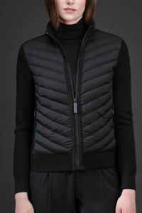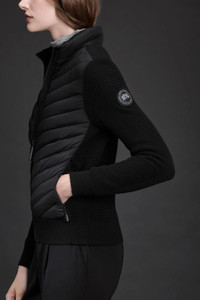 Specially designed to be worn on its own in milder temperatures or under heavier seasonal jackets, this slim-fitting style combines the lightweight warmth of down with ultra-fine Merino wool. Elaborate quilting and a modern standing collar lend timeless sophistication to a go-to winter essential. Thermal Mapping® technology across the upper back lends natural temperature moderation and improved breathability. FEATURES - Strategically placed down-filled panels at the collar and front body add durability, warmth and element protection where you need it - Thermal mapping® technology increases breathability in areas that are prone to overheating with a more open knit construction at the upper back - Rib-knit cuffs and hem add comfort and shape retention - 2 exterior pockets: front pockets with zipper closures are lined with soft knit fabric at knuckle side for comfort - Made with traceable and mulesed free extra-fine Merino wool - Canada Goose Black Label Disc on left sleeve