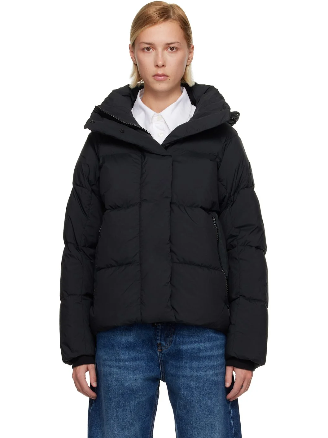 Down-filled and quilted lightweight nylon taffeta jacket. · Water-repellent and wind-resistant · Bungee drawstring and cinch strap at detachable hood · Reflective trim at stand collar · Concealed zip closure at press-stud placket · Zip pockets at waist · D-ring at front · Concealed bungee-style drawstring at hem · Raglan sleeves · Embroidered logo patch at sleeve · Inset rib-knit cuffs · Logo-woven shoulder straps at interior · Mesh patch pockets at interior · Fully lined Part of the Black Label collection. Supplier color: Black Body: 100% polyamide. Fill: 90% duck down, 10% duck feather. Lining: 100% polyester. Made in Canada 252014F061023
