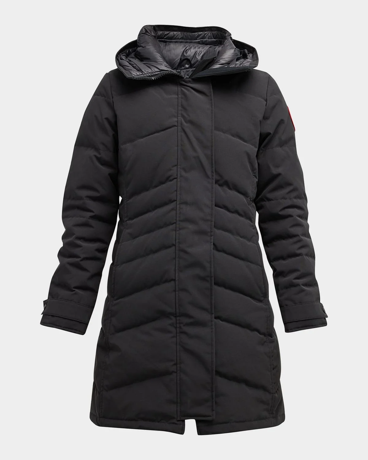 Canada Goose "Lorette" parka coat with a signature logo patch on the sleeve Stand collar Zip front; snap placket covered Long sleeves; button cuffs Side slip pockets Midlength Relaxed fit Polyester/cotton Lining: Recycled nylon Fill: Down/feather Made in Canada