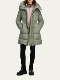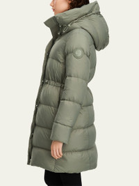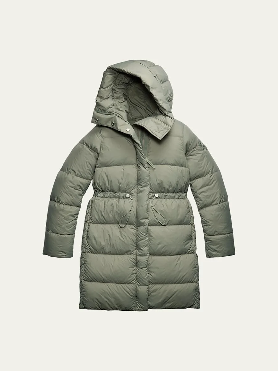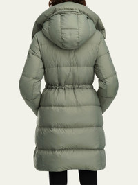 Crafted from ultralightweight Lumina, the "Montgomery" downfilled coat by Canada Goose features an Aline silhouette with cinchable drawcord waist for a custom fit. Cold weather protection down to 4°F. Interior backpack straps fro handsfree carrying. Adjustable hooded neckline Long sleeves with ribknit cuffs Signature logo patch on the left sleeve Side zip pockets Classic fit Midthigh length Twoway zipfront with snap placket Nylon/polyamide Fill: Down/feather Lining: Nylon Machine wash cold, inside out Made in Canada