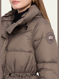 Crafted from ultralightweight Lumina, the "Montgomery" downfilled coat by Canada Goose features an Aline silhouette with cinchable drawcord waist for a custom fit. Cold weather protection down to 4°F. Interior backpack straps fro handsfree carrying. Adjustable hooded neckline Long sleeves with ribknit cuffs Signature logo patch on the left sleeve Side zip pockets Classic fit Midthigh length Twoway zipfront with snap placket Nylon/polyamide Fill: Down/feather Lining: Nylon Machine wash cold, inside out Made in Canada